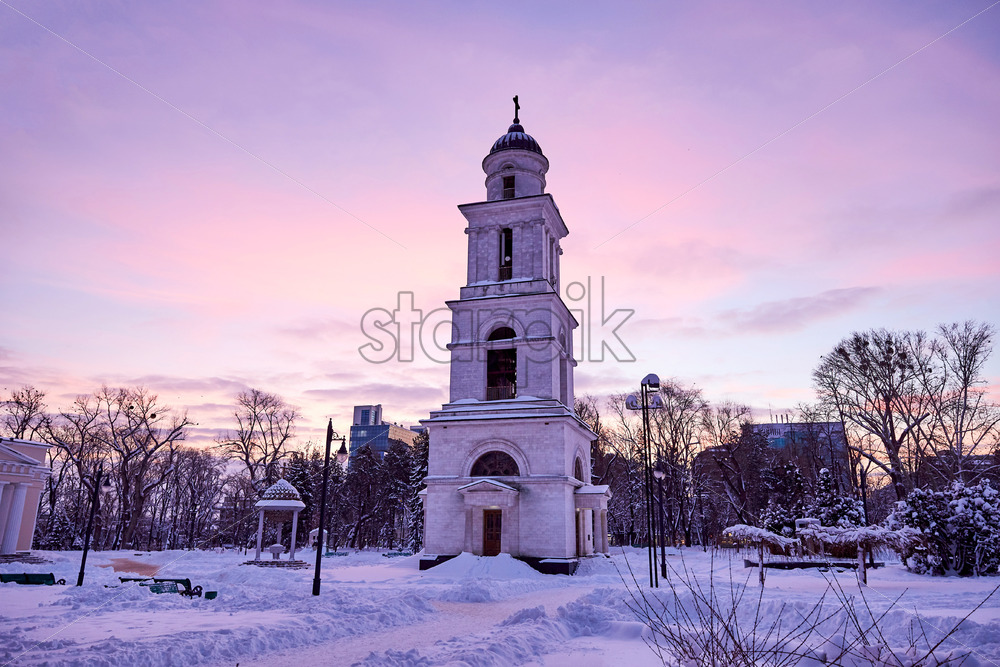 Aerial drone view of the Bell tower and the Metropolitan Cathedral of Christ’s Nativity. City center covered in snow at sunset in Chisinau, Moldova Royalty Free Stock Video Footage