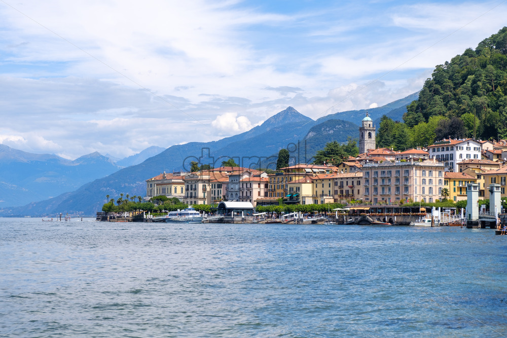Bellagio city from side view. Mountains and cloudy sky on background. Lake Como, Italy Royalty Free Stock photo