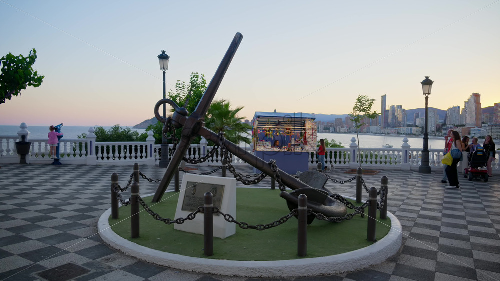 Benidorm, Spain – May 25, 2025: Old cannons and white-and-blue turrets at the Plaza del Castell in the evening Royalty Free Stock Video Footage
