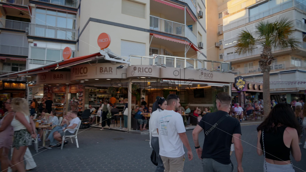 Benidorm, Spain – May 25, 2025: Busy Levante promenade with mobility scooters and beachwear shops in the evening Royalty Free Stock Video Footage