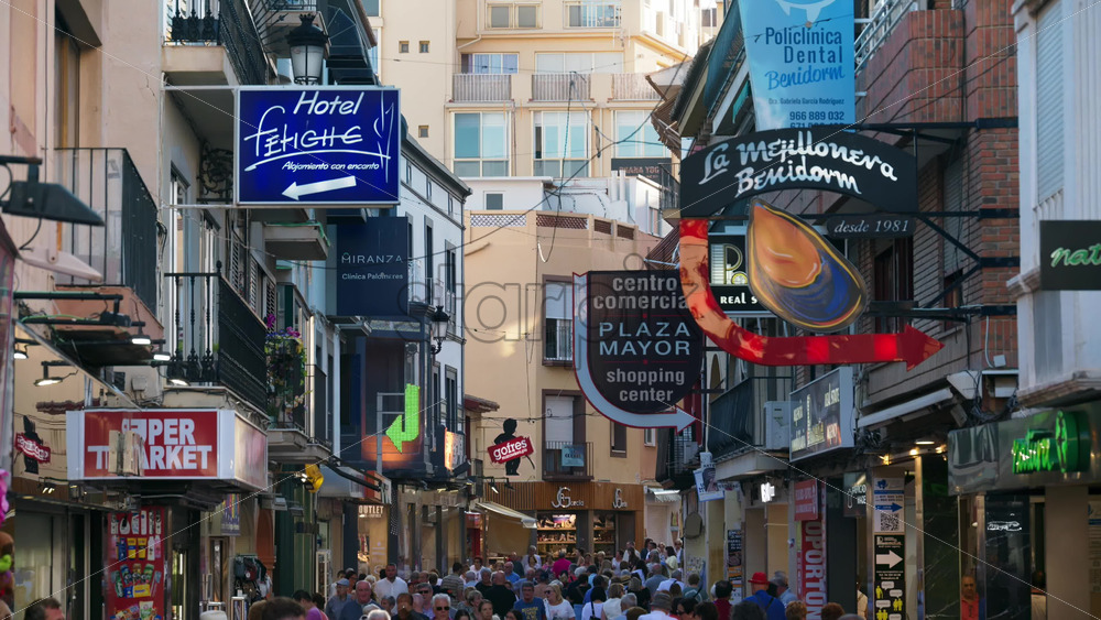 Benidorm, Spain – May 25, 2025: Crowded pedestrian street funneling toward Levante Beach in the Old Town Royalty Free Stock Video Footage