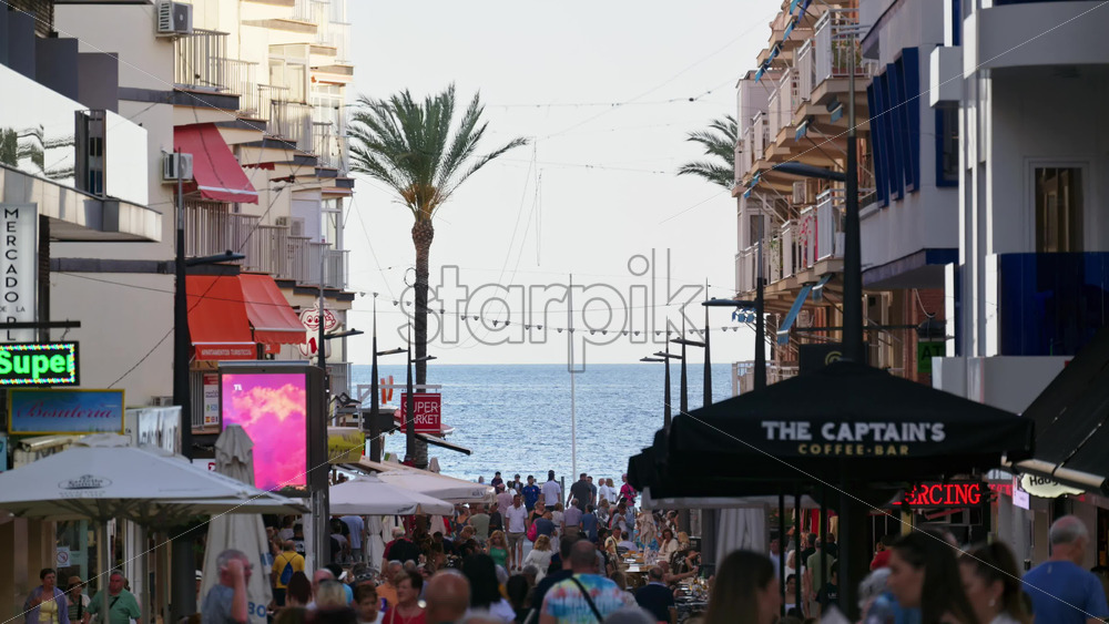 Benidorm, Spain – May 25, 2025: Crowded pedestrian street funneling toward Levante Beach in the Old Town Royalty Free Stock Video Footage