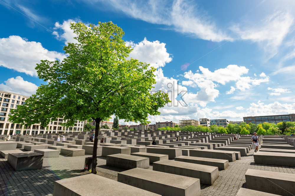 BERLIN, GERMANY – SEPTEMBER, 2022: View of the Memorial to the Murdered Jews of Europe. Rows of rectangular concrete blocks with people and few green trees