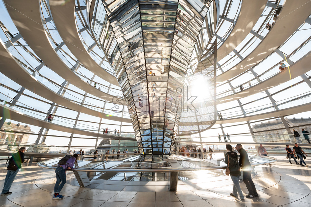 Home » Shop » photo » BERLIN, GERMANY – SEPTEMBER, 2022: View of the Reichstag glass modern dome from inside with tourists in city downtown