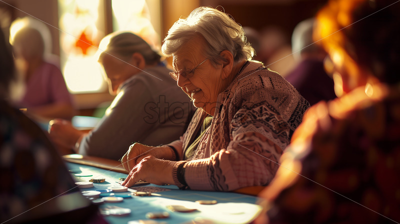 Elderly individuals enjoying a game of bingo at a community center or retirement home, fostering social connections and friendly competition.