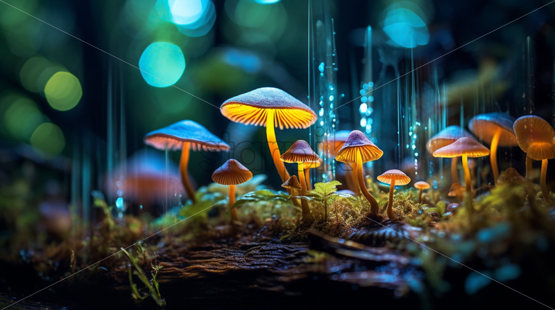 Home » Shop » Uncategorised » Bioluminescent mushrooms casting an enchanting glow in the mysterious depths of the jungle