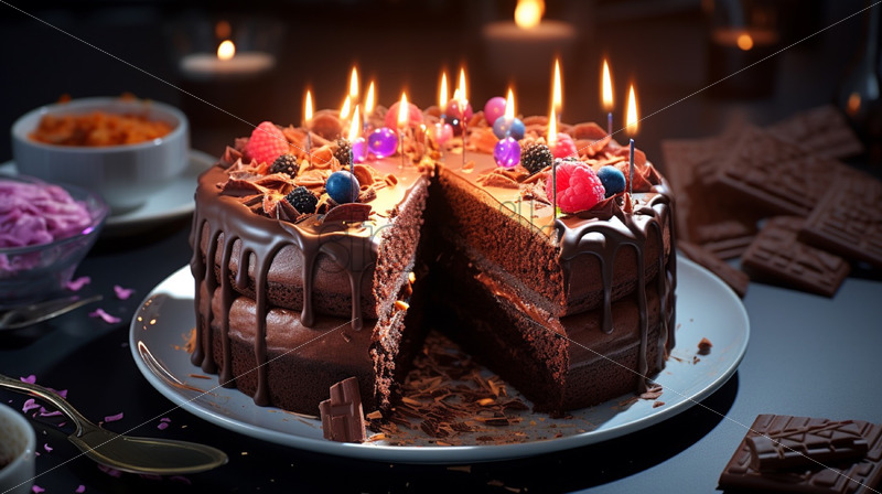 The birthday cake adorned with candles, frosting, and vibrant decorations
