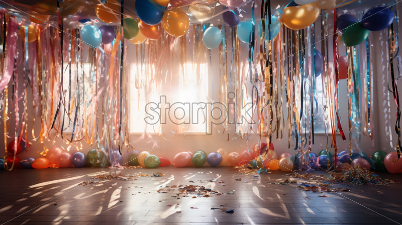 Birthday party with hanging ribbons and garland in decorated room