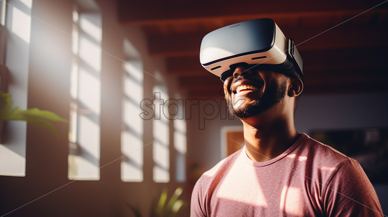 Black american man enjoying his virtual reality goggles in their entertainment room surrounded by some of the greenery plant