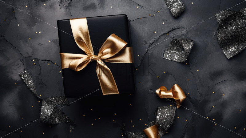 Black luxury gift box with golden ribbon banners