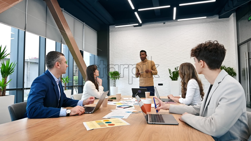 Black male team leader at business meeting in an office, discussing business affairs with other workers, papers with charts and gadgets on the table
