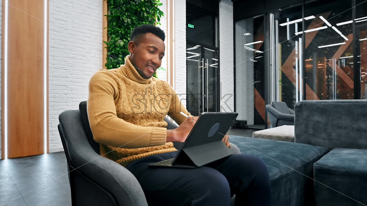 Black man working using a tablet while sitting on a sofa in an office. Slow motion Royalty Free Stock Video Footage