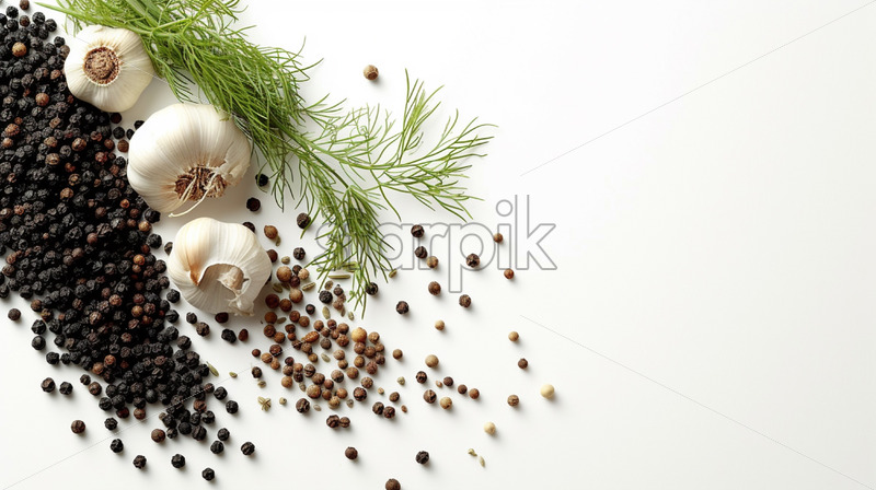 Black peppercorns and fennel seeds on white background