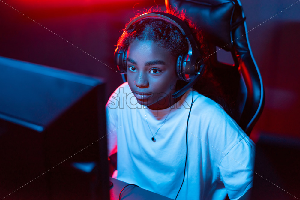 Black teen girl in headset playing video games in video game club with blue and red illumination