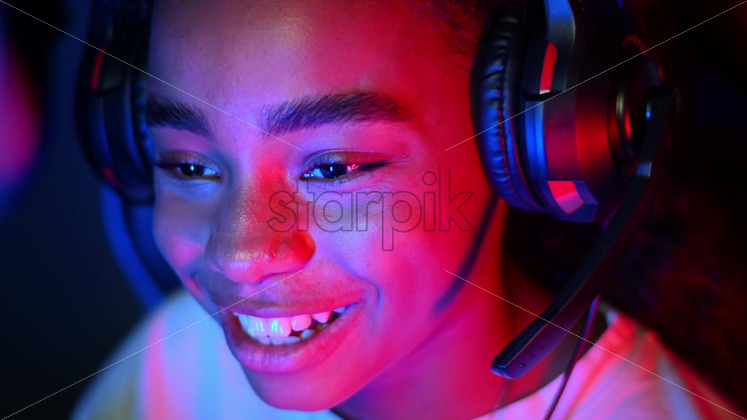 Black teen girl in headset playing video games in video game club with blue and red illumination, laughing and talking in voice chat. Slow motion Royalty Free Stock Video Footage