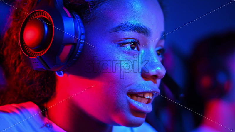 Black teen smiling girl in headset playing video games in video game club with blue and red illumination. Keyboard with illumination