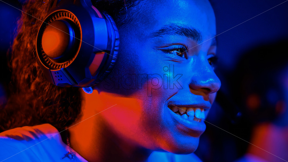 Black teen smiling girl in headset playing video games in video game club with blue and red illumination