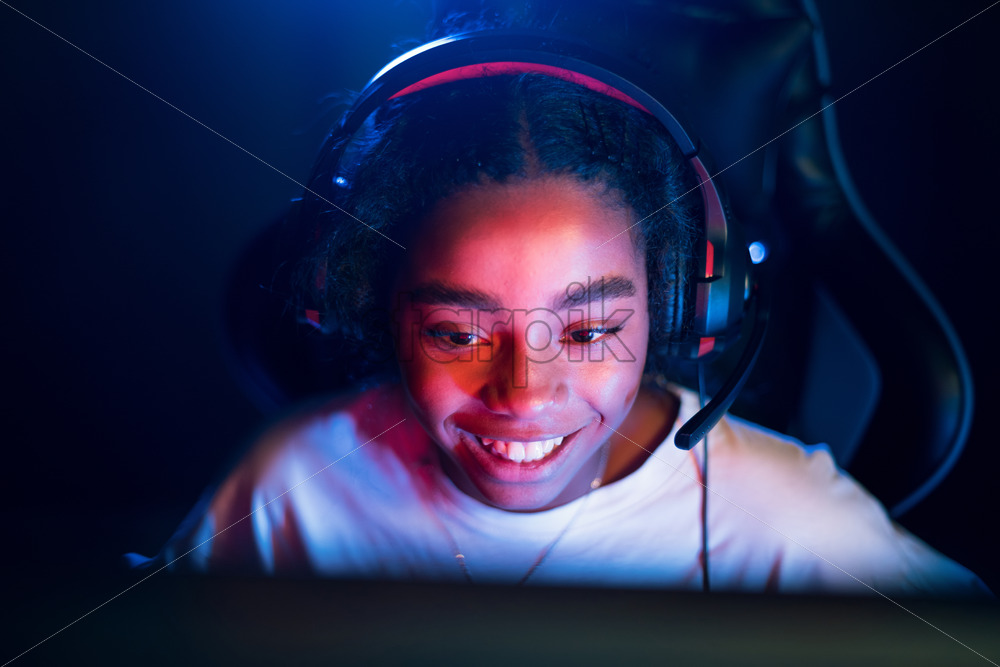 Black teen smiling girl in headset playing video games in video game club with blue and red illumination
