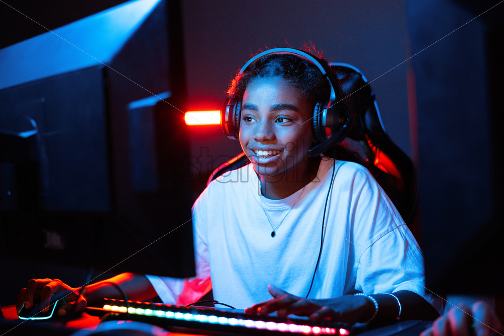 Black teen smiling girl in headset playing video games in video game club with blue and red illumination