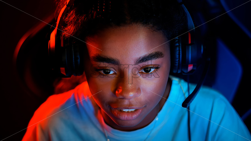 Home » Shop » people » Video – Black teen smiling girl in headset playing video games in video game club with red illumination