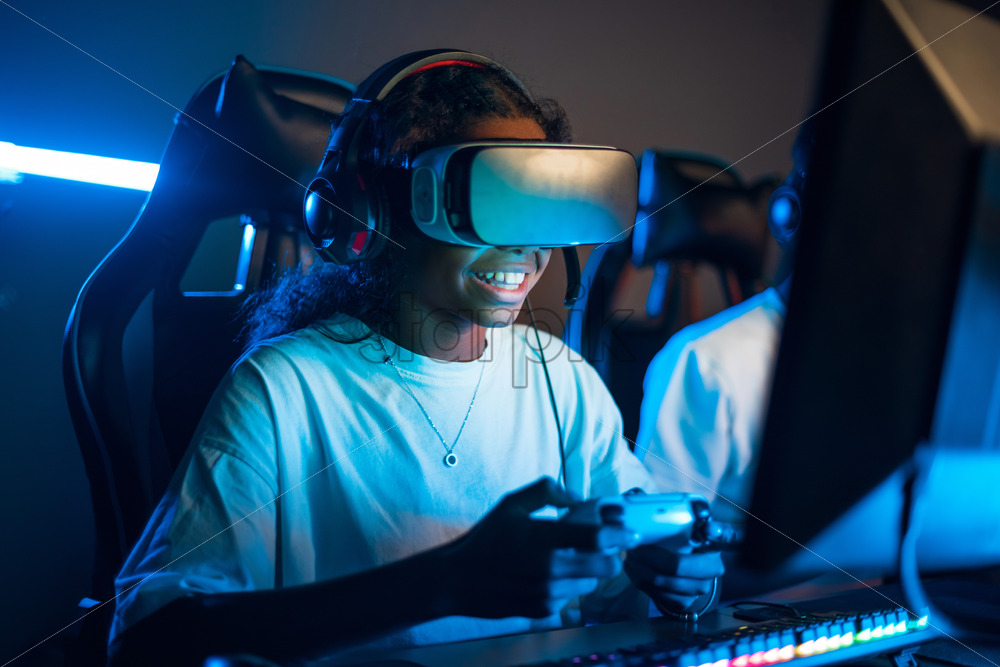 Premium stock photo – Black teen smiling girl in VR headset playing video games using gamepad in video game club with blue illumination Download royalty free stock photo