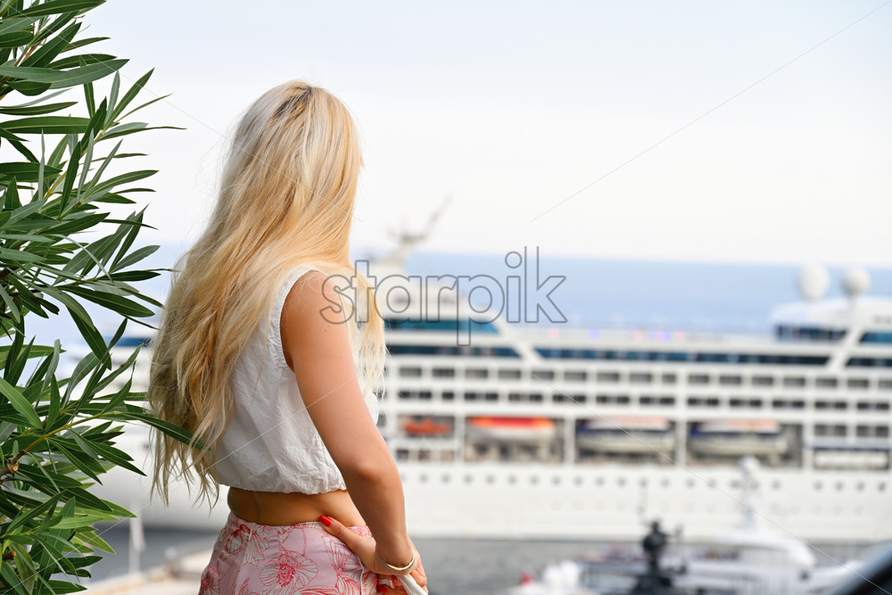 Portrait of two blonde women in Monaco. Looking into the camera. Classic building on the background