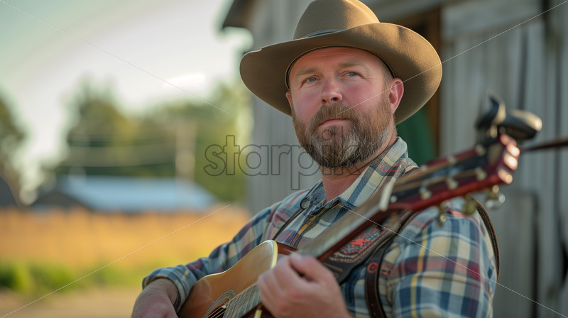 A bluegrass musician’s performance. With barns in the background, the soft, natural daylight illuminates the musician’s face as he fully engage in the music.