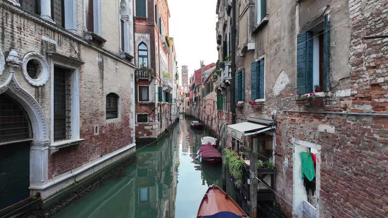 VIDEO Aerial drone shot of a boat sailing on the canal at daytime in Venice, Italy Royalty Free Stock Video Footage