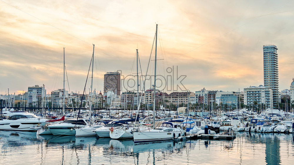 Boats in Port of Alicante. Sunset and mountain in the background