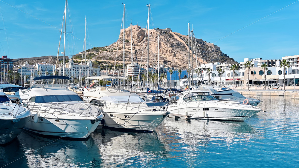 View of the sea port in antibes, France. Moored boats and yachts, Fort Carre on the background, greenery