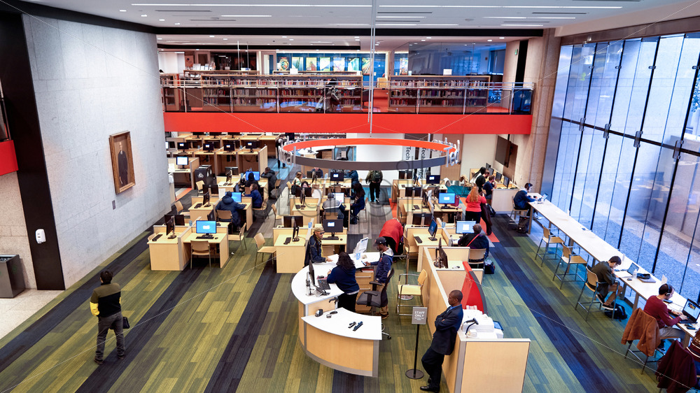 BOSTON, MASSACHUSETTS – OCTOBER 5, 2019: Hall with lots of computers and occupied people inside the Public Library