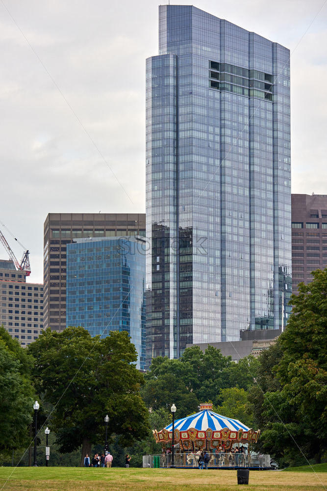 Home » Shop » photo » BOSTON, MASSACHUSETTS – SEPTEMBER 10, 2019: Shot of the lawn in the park with children’s attraction with a huge glass skyscraper behind it