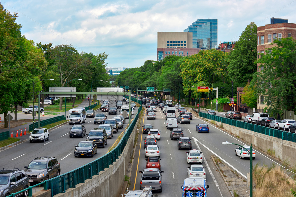 BOSTON, MASSACHUSETTS – SEPTEMBER 10, 2019: View of a busy highway full of cars. The road passes by rows of lush trees and many buildings