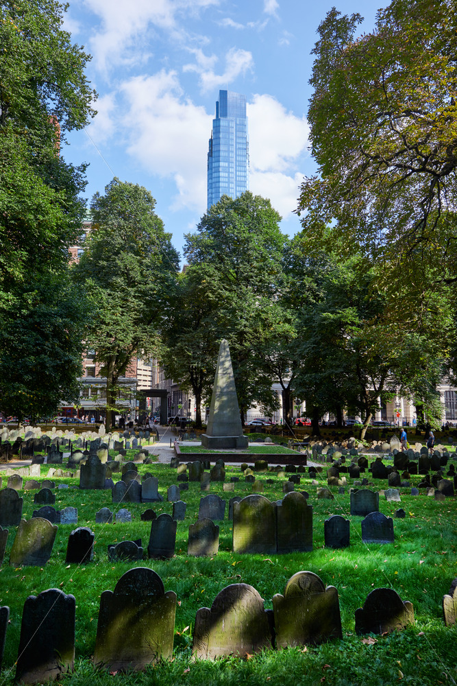 BOSTON, MASSACHUSETTS – SEPTEMBER 11, 2019: Benjamin Franklin memorial located in Freedom trail graves of famous patriots