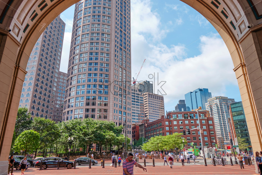 BOSTON, MASSACHUSETTS – SEPTEMBER 11, 2019: Shot of multiple modern buildings located in city downtown with busy street full of cars and walking people