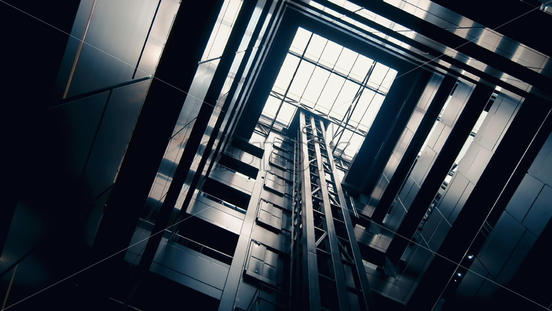 Bottom-up view of interior of a modern office. Black walls, elevator, panoramic roof Royalty Free Stock Video Footage