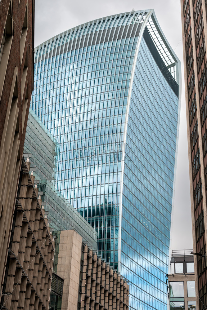 Bottom-up view of London City financial district with skyscraper and old buildings, United Kingdom