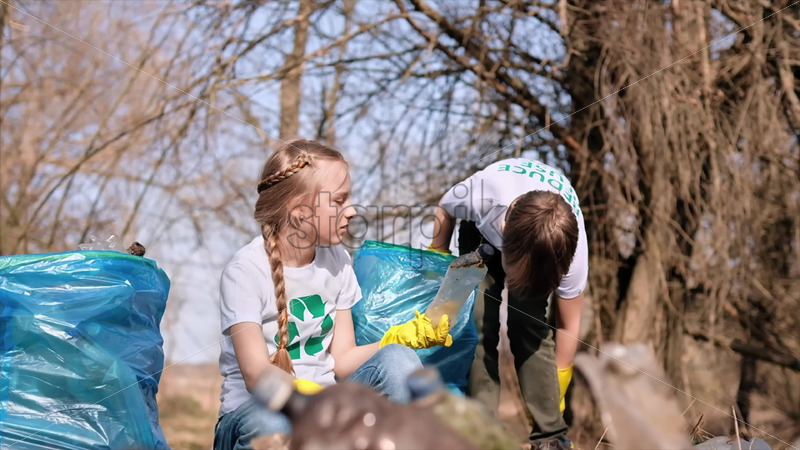 Boy and girl collecting plastic garbage in a bag in a polluted clearing, recycling signs on the T-shirts. Slow motion Royalty Free Stock Video Footage