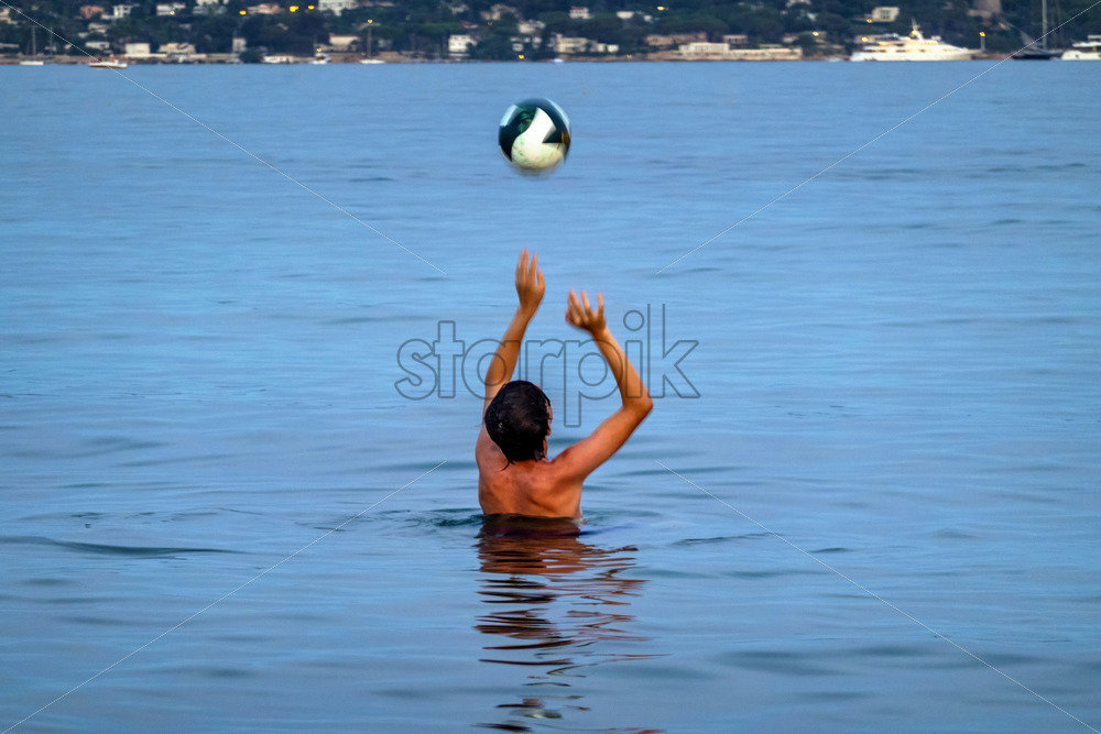 Boy playing with soccer ball at the sea in the evening while swimming, France, Golfe Juan Vallauris