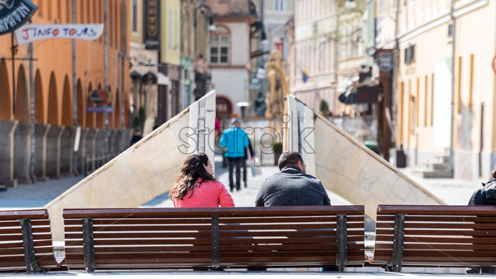 BRASOV, ROMANIA – APRIL, 2022: A couple sitting on the bench in old city centre. Pedestrean street with walking people