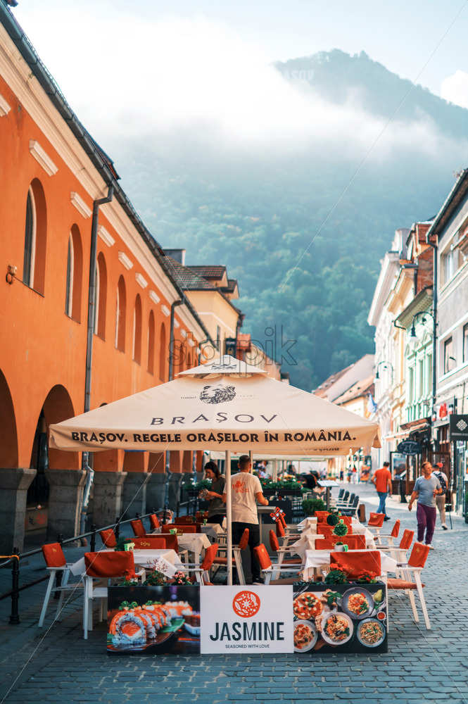 BRASOV, ROMANIA – AUGUST 27, 2023: View of street with classic buildings and cafes in old city centre. Clouds, hill with greenery on the background