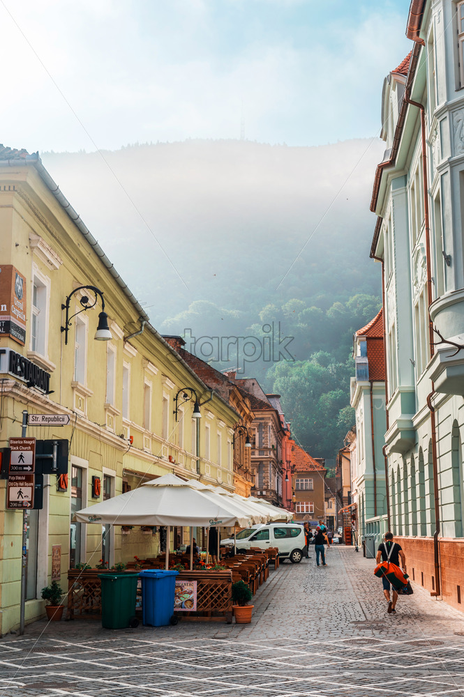 BRASOV, ROMANIA – AUGUST 27, 2023: View of street with classic buildings and cafes in old city centre. Clouds, hill with greenery on the background