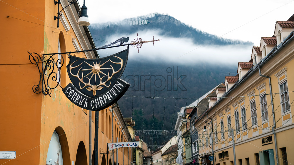 BRASOV, ROMANIA – DECEMBER, 2021: City old center with Tampa mountain on background. Cloudy day