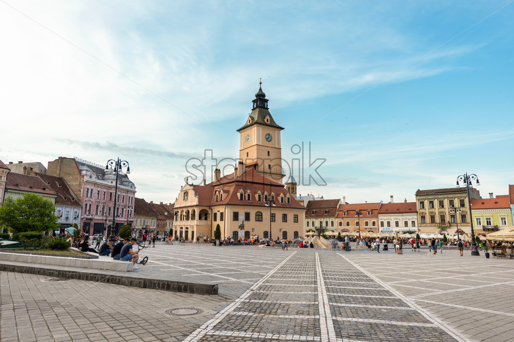 BRASOV, ROMANIA – JULY, 2022: View of the old city centre. Council Square with County Museum of History and walking people, restaurants and old buildings