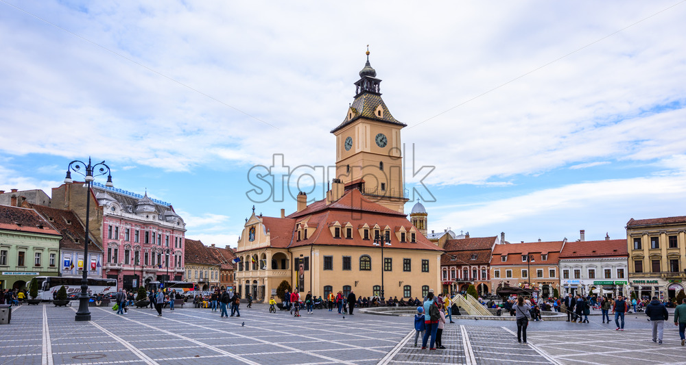 BRASOV, ROMANIA – OCTOBER 27, 2018: Historical architecture buildings and museum of history in the old city square. People exploring local beauties Royalty Free Stock photo