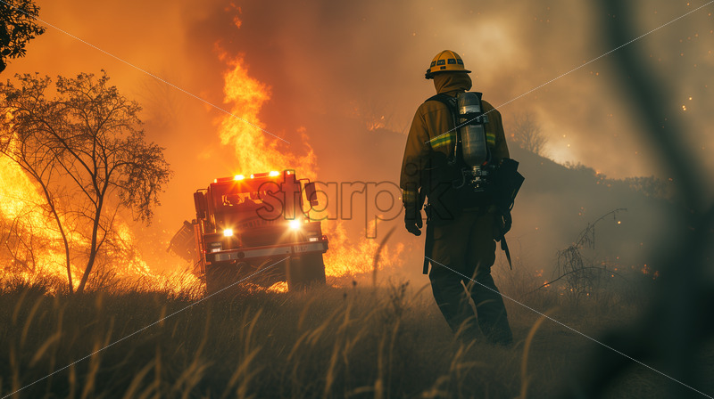 A brave firefighter near a wildfire, standing near a specialized firefighting vehicle, with flames and smoke in the background.