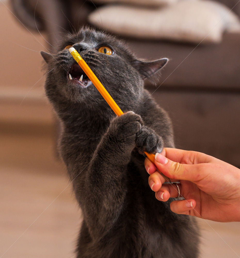 British shorthair cat with grey fur and orange eyes playing with pencil , Chisinau, Moldova