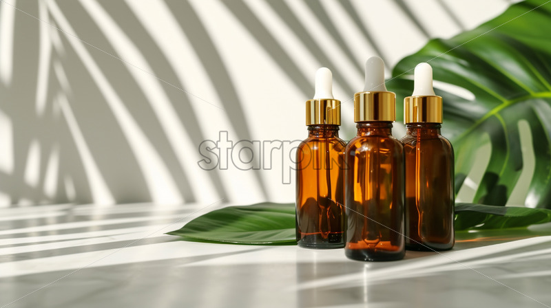 Brown glass bottles with gold lid, standing on table with tropical leaf