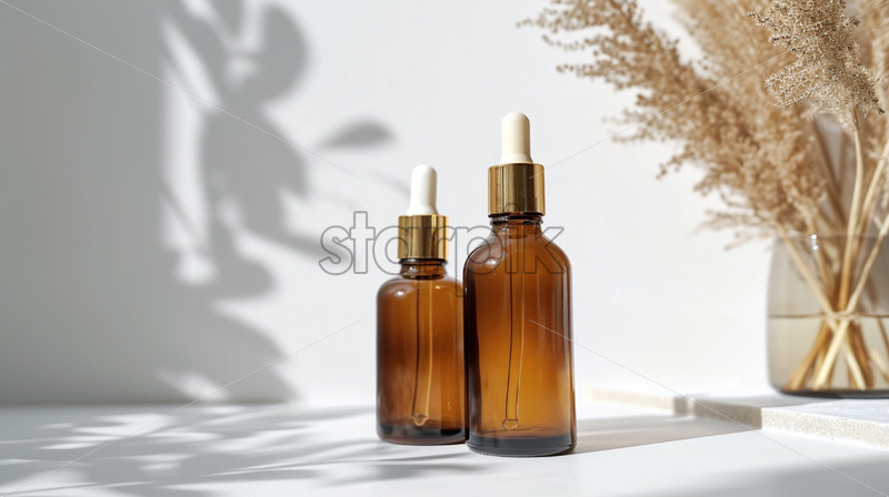 Brown glass bottles with gold lid, standing on table with tropical leaf