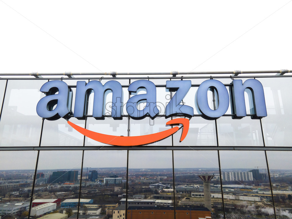 Home » Shop » photo » BUCHAREST, ROMANIA – 20 DECEMBER, 2020: Modern commercial office building with Amazon logo, glass facade with city view reflected. View from the drone at cloudy weather